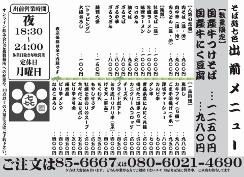 営業時間中は出前を承っております。 出前のご注文は 0237-85-6667 080-6021-4690 メッセンジャー・LINEでも承っております。ご注文お待ちしております。 |